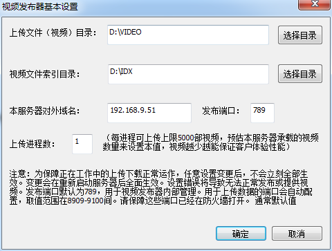 為保障正在工作中的上傳下載正常運(yùn)作,任意設(shè)置變更后,不會(huì)立刻全部生效。變更會(huì)在重新啟動(dòng)服務(wù)器后全面生效。設(shè)置錯(cuò)誤將導(dǎo)致無(wú)法正常發(fā)布或提供視頻。發(fā)布端口默認(rèn)為789,用于視頻發(fā)布器內(nèi)部管理。用于上傳數(shù)據(jù)的端口會(huì)自動(dòng)配置,取值范圍在8909-9100間。請(qǐng)保障這些端口已經(jīng)在防火墻打開。 通常默認(rèn)值