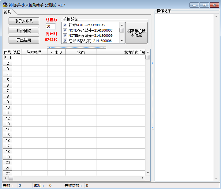 1、軟件主要分了三個版塊:搶購操作區(qū)、帳號區(qū)、操作記錄區(qū)2、界面精簡,設(shè)置簡單,沒有那些復(fù)雜的選項,小編覺著看這款軟件還是比較舒服的