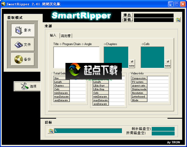 當(dāng)您要備份DVD影片時,不管您是要將它轉(zhuǎn)成特殊壓縮格式或是燒錄備份,若是能將DVD光盤中的影片文件事先復(fù)制到硬盤,一定比直接由光盤中讀取來的快速與穩(wěn)定。不過DVD影片通常都有CSS保護著,不是那么輕易就能復(fù)制,這時我們就必須依賴SmartRipper這套軟件中避開CSS偵測的這項功能,才能成功的將影片文件復(fù)制到硬盤。使用這款程序,只要先將光盤放入DVD-ROM驅(qū)動器。 SmartRipper會自動檢測到光盤,并在最短時間內(nèi)確保所有的文件可讀。 一旦完成,您將看到主界面顯示。 該軟件支持三種操作模式:“'電影”(僅復(fù)制電影)、“文件”(僅復(fù)制選中的文件)和“備份”(復(fù)制整張磁盤)。 顯然,最靈活的選擇就是“文件”模式,因為它允許您通過復(fù)選框選擇需要備份文件。 如果您不確定需要從磁盤復(fù)制出哪些具體的文件,那么“備份”模式是最好的選擇。