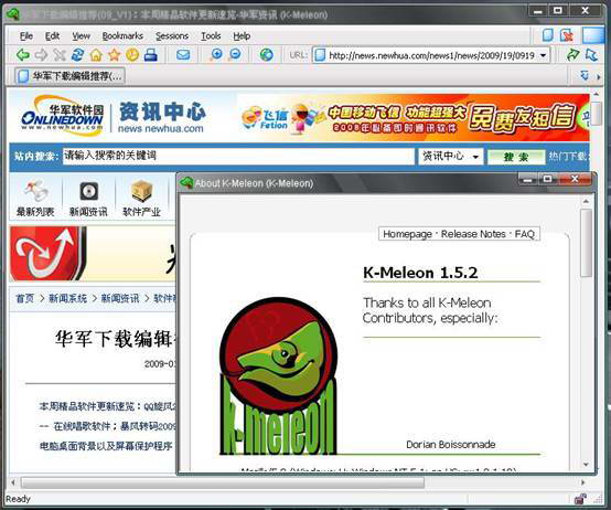 K-Meleon是一個(gè)快速的瀏覽器,使用 Gecko 引擎。它的界面模仿IE的風(fēng)格,并且能夠使用IE的書簽。它最主要的特點(diǎn)就是下載頁面的速度相當(dāng)?shù)目欤@對(duì)于網(wǎng)速不是很快的中國用戶還是很有優(yōu)勢(shì)的。