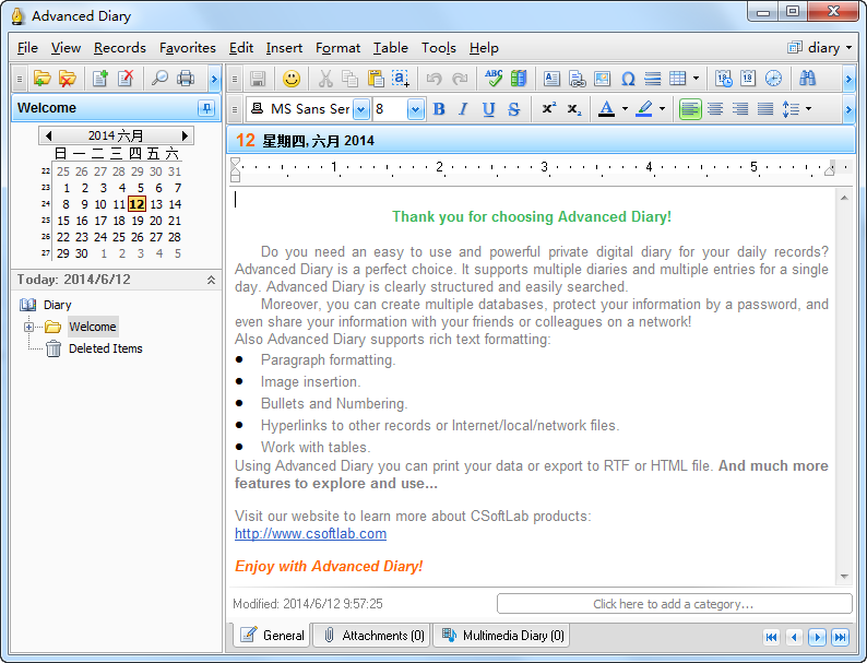 你是不是需要一個既簡單又免費的私人數(shù)字日記本,用它來記錄您每天的日記?Advanced Diary就是您的最佳選擇。它支持每天多篇日記和多個條目。這是一個獨特的功能,因為沒有其他日記軟件能夠讓您在一個單一的數(shù)據(jù)庫文件中保存多篇日記。