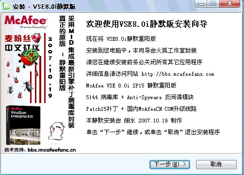 發(fā)布McAfee VirusScan Enterprise Version 8.0i/8.5i 靜默重陽版(完全的官方原版) 如果你已經(jīng)使用了國慶特別版,可以忽略此貼,重陽版不帶任何自定義策略,僅對(duì)官方版本作了集成最新引擎和病毒庫以及補(bǔ)丁。