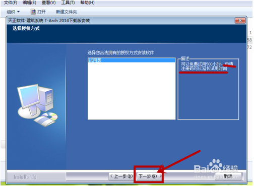 選擇“試用版”點(diǎn)擊“下一步”,旁邊小編有標(biāo)出來解釋一下的紅線,是安了試用版后再生成注冊(cè)碼激活