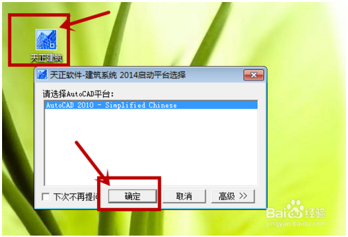打開在桌面上生成的“天正建筑2014”的快捷鍵,電腦讓你選擇cad平臺(tái)。小編的2010cad。點(diǎn)擊“確定”