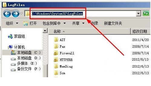 2、在地址欄輸入地址:C:\Windows\System32\LogFiles ,按下回車鍵跳轉(zhuǎn)到logfiles文件夾