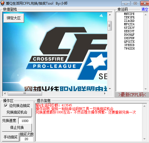 CFPL5自動兌獎抽獎工具最新可用CFPL5全自動兌獎抽獎軟件,軟件可以讓你邊兌獎邊抽獎,配合最新最全的CFPL5幸運碼大全使用,更新至89個,每次兌換可獲得一次抽獎機會,豐富的獎品還是跑不掉的。