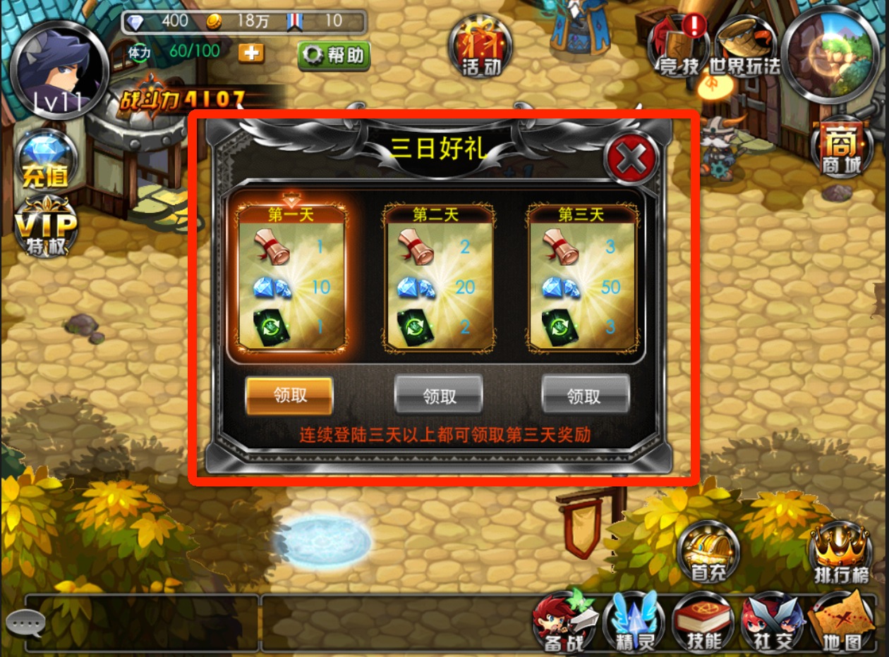 小金錢禮包*5、小功勛禮包*6、3級卡牌包*4、鉆石*50【疾風勇者傳更新日志】