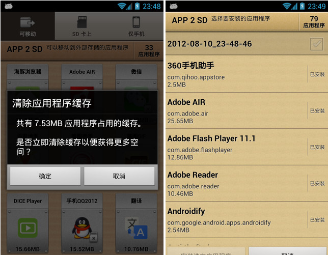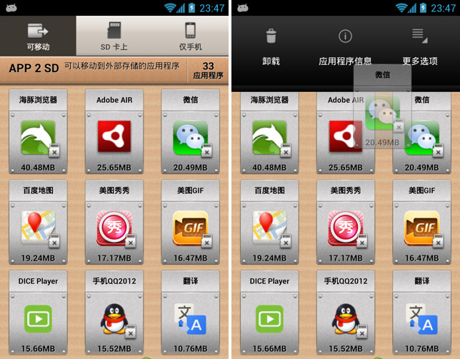 眾所周知,Android 2.2及以上系統(tǒng)可以將APK移動到SD卡,但系統(tǒng)自帶的移動功能很不好用,需要一個一個地查找,有了App 2 SD以后就方便多了,它可以幫助您通過系統(tǒng)設(shè)置來將應用程序移動到內(nèi)部或外部存儲,而且會自動檢測可/不可移動以及SD卡中的應用程序,并將其分窗口顯示,而且支持一鍵移動所有應用程序,非常方便。AppMgr (原名為 App 2 SD) 是一個全新設(shè)計的新一代應用,他主要提供有下列幾項主功能: