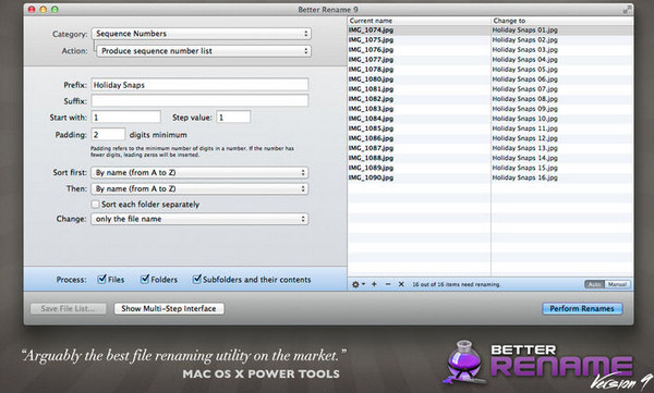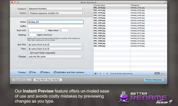 Better Rename 9 for mac V9.42 官方版 mac批量重命名工具(Better Rename 9),它方便用戶在mac ox系統(tǒng)上快速批量修改文件名,只需設(shè)置文件的前綴名稱和后綴的規(guī)則即可,簡(jiǎn)單好用,提高工作效率。