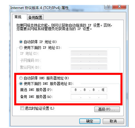7、將使用下面的DNS服務(wù)地址中的的“首選DNS服務(wù)器地址”修改為8.8.8.8,點擊確定即可正常更新或鏈接網(wǎng)易電競平臺。