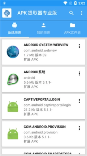 2、打開應(yīng)用后,軟件會自動獲取設(shè)備上的全部應(yīng)用信息,涵蓋系統(tǒng)應(yīng)用、個人安裝的應(yīng)用以及APK文件夾等內(nèi)容。