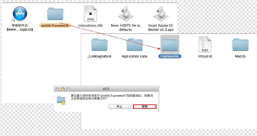 找到 Contents / Frameworks 【把破解包 Adobe CC crack kit 1.0.zip 解壓 使用 amtlib.framework 替換 】
