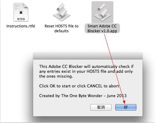 重要:此時一定要運行 破解包 Adobe CC crack kit 1.0 里面的 Smart Adobe CC Blocker v1.0 文件,如圖