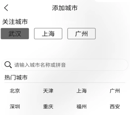 在挑選城市時,系統(tǒng)會為用戶推薦一些熱門城市,用戶直接點擊就能查看當?shù)氐奶鞖馇闆r。