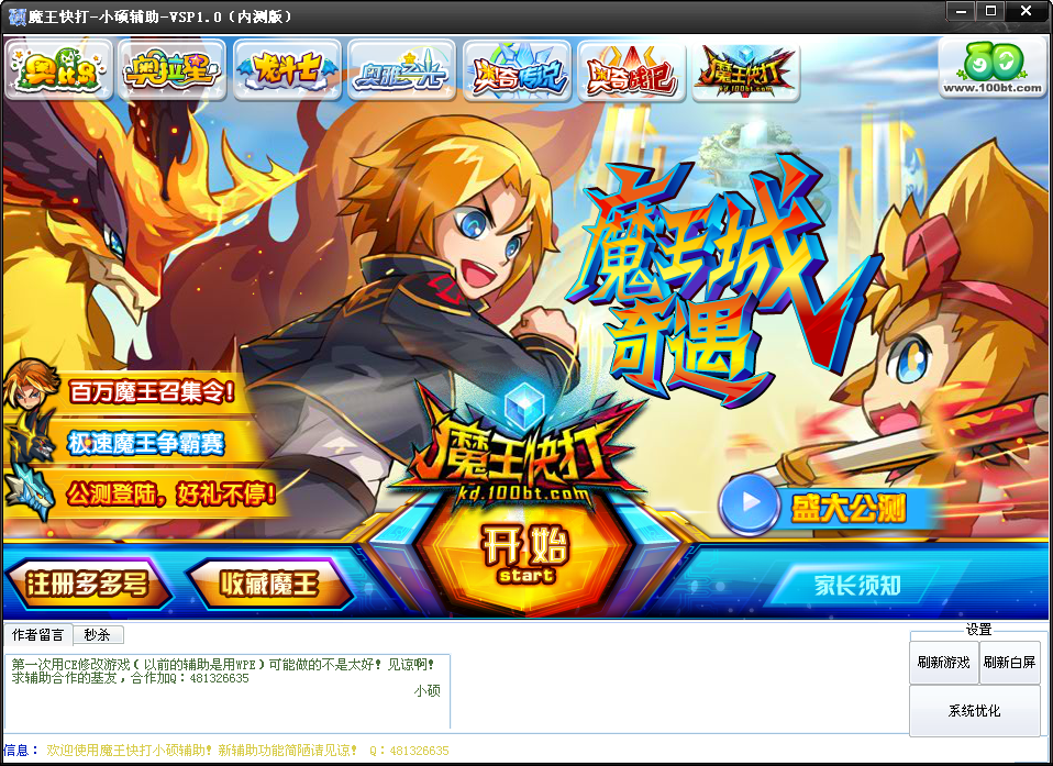 小碩魔王快打輔助功能有超神秒殺、刷新游戲、刷新白屏和系統(tǒng)優(yōu)化,是《魔王快打》的綠色免費(fèi)純輔助工具,由于魔王快打游戲目前剛公測,所以輔助的內(nèi)容也不多,以后魔王快打小碩輔助肯定還會陸續(xù)增加新功能的。