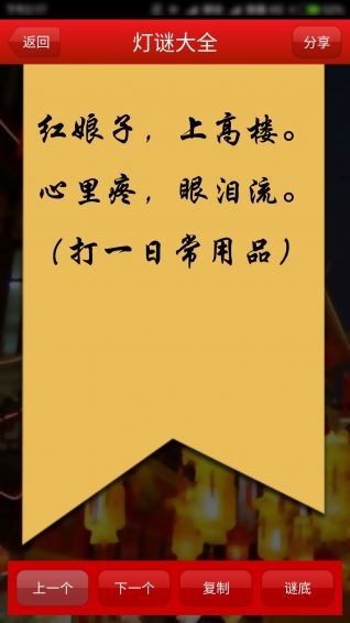 燈謎大全app收集匯總了大量燈謎,豐富了燈節(jié)的娛樂活動(dòng)。喜歡猜燈謎的小伙伴可以直接下載燈謎大全app來猜猜猜哦。【更新日志】