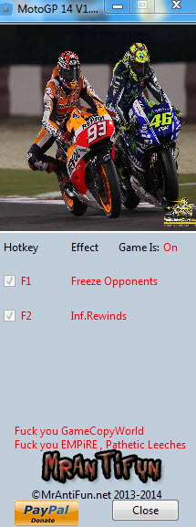 世界摩托大獎(jiǎng)賽14修改器有凍結(jié)對(duì)手和無(wú)限重放兩項(xiàng)修改功能,在游戲中絕對(duì)有很大的用處。世界摩托大獎(jiǎng)賽14年最新版與大家見面啦,是非常真實(shí)、強(qiáng)大的摩托車競(jìng)技游戲作品,玩起來(lái)很爽!