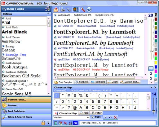 FontExplorerL.M V5.6.3 英文綠色免費(fèi)版 這款字體瀏覽應(yīng)用軟件讓你可以在已經(jīng)安裝在你的系統(tǒng)中的字體或者從硬盤(pán)驅(qū)動(dòng)器上安裝的帶有樣本、預(yù)覽、立體瀏覽、文本編輯、打印預(yù)覽以及用于選擇字體的Windows操作系統(tǒng)字符映射表的臨時(shí)安裝字體中進(jìn)行導(dǎo)航