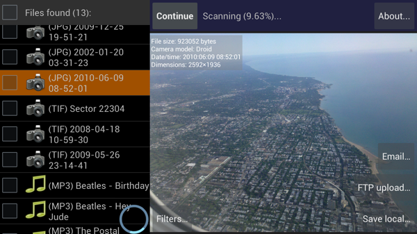 (植根設(shè)備只?。〥iskDigger可以取消刪除和恢復(fù)丟失的照片,文檔,視頻,音樂和更多的從你的記憶卡或內(nèi)存(見下文支持的文件類型)。無論您意外刪除的文件,甚至格式化存儲卡,DiskDigger的強大的數(shù)據(jù)恢復(fù)功能,可以找到你丟失的文件,讓你恢復(fù)它們,并將它們發(fā)送到一個電子郵件帳戶,或?qū)⑺鼈兩蟼鞯紽TP服務(wù)器。有關(guān)完整說明,請參閱http://diskdigger.org/android