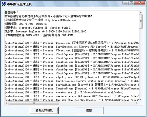 360安全衛(wèi)士系統(tǒng)診斷工具 V1.20 綠色免費(fèi)版 提供系統(tǒng)診斷功能,能夠?qū)ο到y(tǒng)的190多個(gè)可疑位置進(jìn)行診斷,并生成診斷報(bào)告,讓更多高手幫您解讀診斷報(bào)告,分析系統(tǒng)問(wèn)題