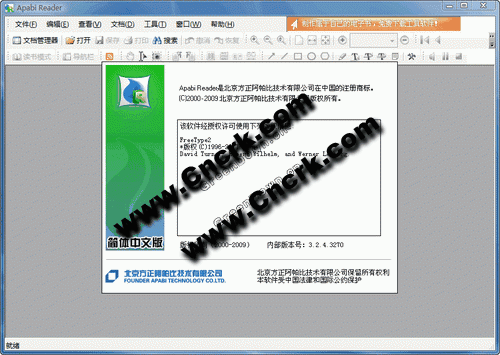 方正Apabi Reader V3.26 簡體中文綠色免費版 方正Apabi Reader是用于閱讀電子書(eBook)、電子公文等各式電子文檔的瀏覽閱讀工具,支持CEB、XEB、PDF、HTML、TXT多種文件格式。方正Apabi Reader的界面友好,盡量使閱讀的感覺接近于傳統(tǒng)紙書的閱讀習慣,其主要功能有翻頁、加批注、加劃線、加書簽、查找等等。常用的中英文電子詞典軟件,可以通過屏幕取詞,對方正Apabi Reader中的詞進行翻譯