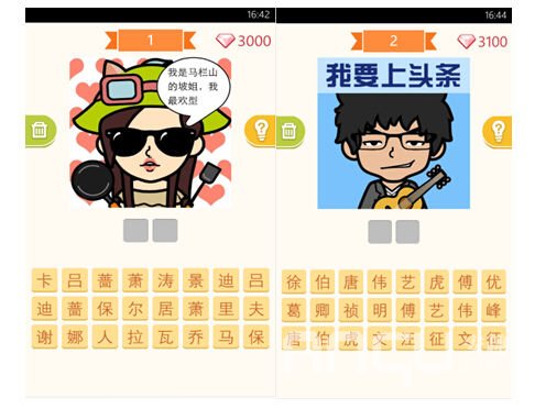 貼心的開發(fā)商害怕有些智商著急的玩家實在猜不出圖中的名字該如何是好,逗趣的他在每個明星身邊都附上了一段不長的旁白,結(jié)合了當(dāng)今事實熱點,緋聞段子,大家耳熟能詳?shù)氖录?,方便大家更快更?zhǔn)確的猜出圖中的是誰,甚至不惜采用嘲諷的方式抨擊小三兒姚笛,結(jié)合熱門娛樂節(jié)目爸爸回來了中吳尊對女兒的愛稱等等。