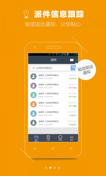 派件免費發(fā)送通知:派件時,支持自主編輯通知模板,免費發(fā)送通知短信告知客戶準備接件、快件異常和代簽收情況;用戶寄件消息提醒:當用戶有寄件請求及留言時,會第一時間推送給您,并且支持文字消息及語音回復(fù);