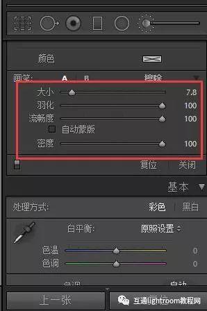 調(diào)整畫筆還具有大小,羽毛,流量和密度的設(shè)置。尺寸和羽毛設(shè)置是為此目的重要的設(shè)置。尺寸設(shè)置將決定用于編輯照片的圓圈的大小。較小尺寸的設(shè)置可以讓您進行更精確的編輯,而較大尺寸的設(shè)置會一次影響更多照片。羽毛決定了刷子邊緣的柔軟度。毛羽為0時,刷子不會發(fā)生過渡,而毛羽為100時,毛刷的柔軟邊緣可以達到平滑過渡的最大面積。對于平滑肌膚,我通常會使用較高數(shù)量的羽毛,比如75.然后,我可以降低需要精細細節(jié)和更高精度的區(qū)域。
