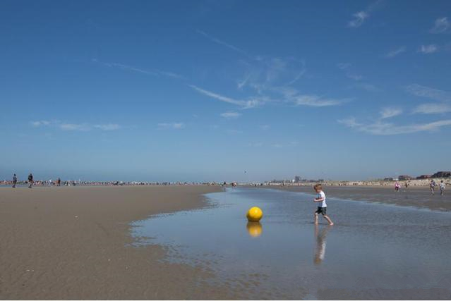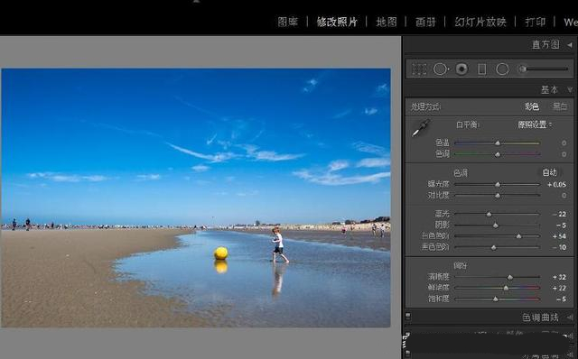 下面這張照片拍攝于海灘,陽光明媚但有些朦朧。一個小男孩跑向一個明亮的黃色浮標躺在一個淺水坑的海水反映了廣闊的藍天與一些羽毛狀的云。設(shè)置(f / 8,1 / 640秒,ISO 125)對于給定的情況是正確的,廣角和高景深使圖像清晰,并且構(gòu)圖效果很好,但是,感覺這張照片可以得到一些提升以反映海邊陽光燦爛的夏日的氣氛。這是直接從相機拍攝的原始圖像: