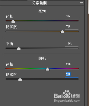 調(diào)色校正,會用到分離色調(diào),細節(jié),效果,相機校準等,分離色調(diào)是把圖像的高光和陰影分別調(diào)成不同的色調(diào)。參數(shù)如圖。