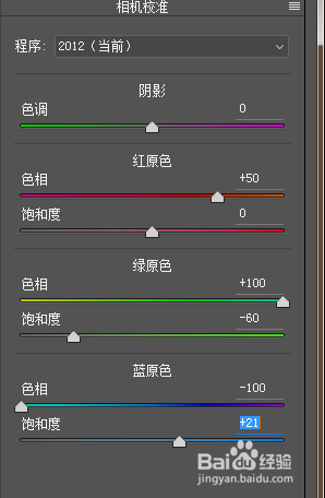 效果是對圖像做一些效果,如顆粒,暈影等,相機校準是對圖像的三原色做調(diào)整,加入某種顏色可以改變顏色的混合比例,參數(shù)如圖做參考。