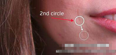 使用鼠標抓住第二個圓圈并將其拖到光滑的皮膚區(qū)域,然后再次單擊。第二圈內(nèi)的區(qū)域?qū)⒂糜谥委煹谝蝗Φ钠つw。Lightroom會自動將其融合,使其與周圍的皮膚區(qū)域看起來很自然。