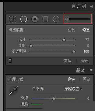 隨著治療的選擇,Lightroom將會使用一些魔法來修復(fù)和融合你正在糾正的區(qū)域,從而獲得更平滑,更自然的外觀。下面您會看到尺寸,羽毛和不透明度的選項。我通常將羽化設(shè)置為0,不透明度設(shè)置為100.尺寸將根據(jù)您正在糾正的區(qū)域大小或缺陷而變化。隨著您增大或減小尺寸設(shè)置,您會注意到圓圈(如下所示)會相應(yīng)增加或減少。