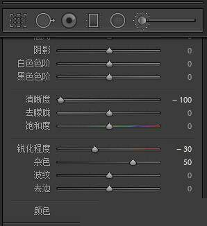 筆刷將應(yīng)用以下設(shè)置:清晰度 - 100,銳化程度-30,雜色+50。