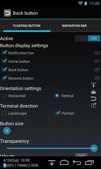Back Button是一款安卓平臺(tái)上手機(jī)虛擬鍵盤軟件,這款手機(jī)按鍵軟件使用也非常簡(jiǎn)單,不需要root安裝設(shè)置后就可以使用了,雖然都是英文的,但也都比較基礎(chǔ)還是比較易懂的。