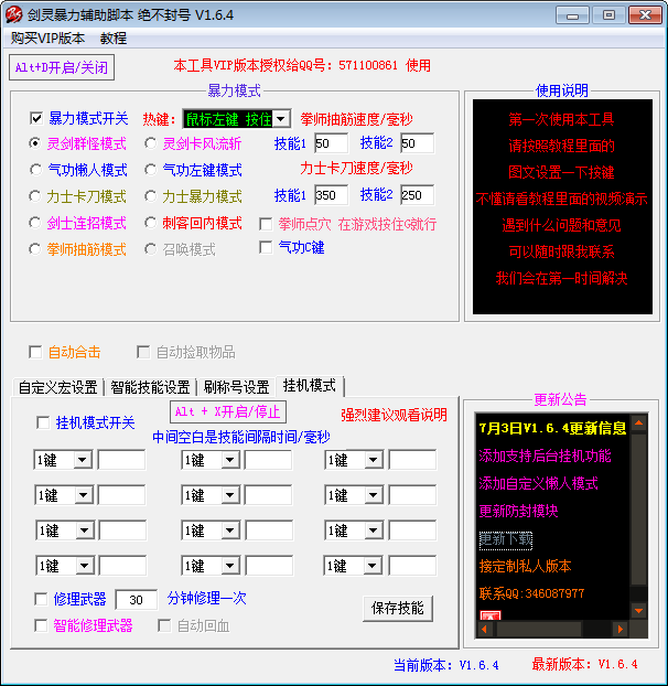劍靈暴力輔助腳本VIP破解版是一款非常暴力的游戲輔助腳本,適用于劍靈游戲掛機(jī)使用,使用輔助可以用于劍靈掛機(jī)洪門神功星經(jīng)驗靈劍氣功刺客力士拳師召喚劍士輔助。無毒無木馬人品保證,不讀游戲內(nèi)存寫內(nèi)存,不違規(guī)游戲規(guī)則,杜絕封號永久使用,不綁定電腦、不幫角色,隨地隨時使用!【劍靈暴力輔助腳本VIP破解說明】