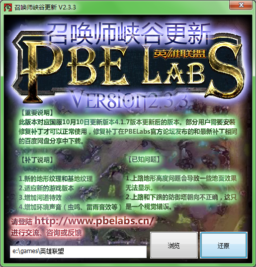 注意!本補(bǔ)丁僅僅適用于英雄聯(lián)盟純凈客戶端(可以直接安裝)或安裝了2.2.2/2.3.0版本的完整客戶端(會(huì)看到還原按鈕,點(diǎn)擊還原后即可安裝)