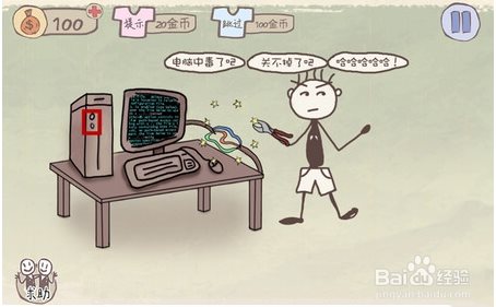 史上最坑爹的游戲攻略第一關(guān):點擊圖片紅框的按鈕,就是左邊電腦的主機的開機按鈕即可,是不是發(fā)現(xiàn)被鉗子誤導(dǎo)了呢?嘿嘿。