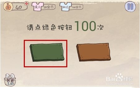 史上最坑爹的游戲攻略第二關(guān):這關(guān)非常的無厘頭,就是按照游戲的說明“請點綠色按鈕100次”,點吧。其中要注意的就是,綠色和黃色的按鈕會出現(xiàn)調(diào)換。