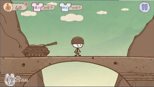 游戲目標(biāo)就是要讓小兵安全的通過大橋??吹蕉垢こ虡?,你當(dāng)然不能直接開著坦克過去,要不然非死不可,點擊坦克,坦克會停下,然后點擊小人,通過即可。