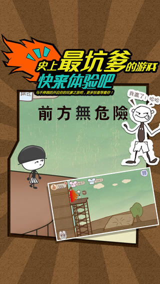 史上最坑爹的游戲攻略第八關(guān):讓主人公知道前方有危險,走回頭路,本關(guān)需要做的是將屏幕上方的無擦掉,然后再點擊人物即可。