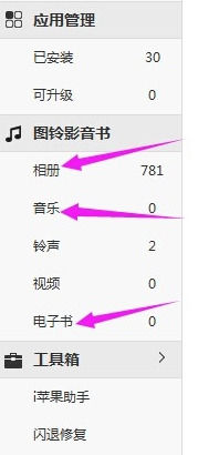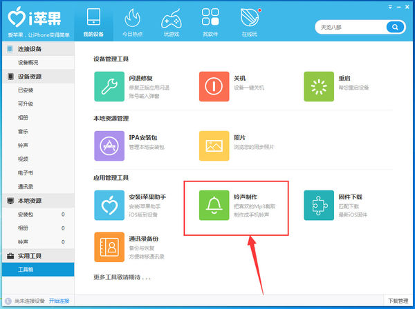 3、這時在“我的設(shè)備”界面左側(cè)打開“工具箱”,在“工具箱”打開“鈴聲制作”;