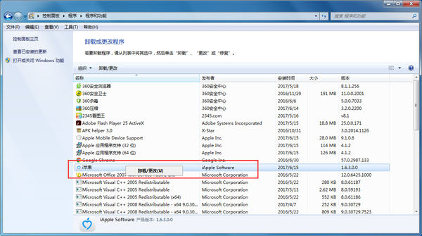 3、接著在卸載程序界面找到“i蘋果”并用鼠標右鍵點擊它,之后在彈出的選項中點擊卸載就可以了。
