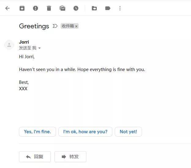 通過(guò)人工智能,新版gmail郵箱還能根據(jù)郵件內(nèi)容在郵件末尾提供智能回復(fù)選項(xiàng)。這些選項(xiàng)通過(guò)白底藍(lán)字的文本框顯示,類(lèi)似于 Gmail 的 app 所提供的功能,即在最后一封電郵下面提供了一些建議。