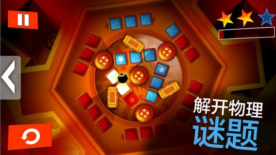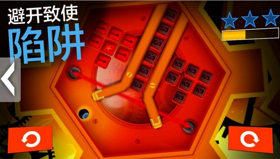 操作并不繁雜,玩家只需觸控屏幕中的兩個按鈕來控制金庫齒輪的旋轉,以此根據物理重力原理來碰撞帶動微型機器人Nano滾動,觸碰里邊的若干紅色按鈕破解金庫密碼,打開金庫大門。雖然操作非常簡單,但是想控制好卻并不容易,除了左右旋轉需要及時和準確的操縱以外,還要考利重力帶來的慣性等物理因素