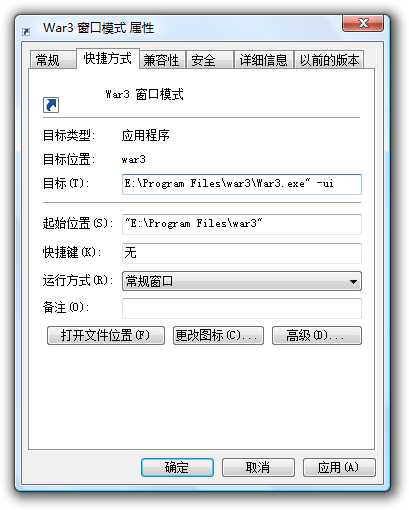 a) 為war3.exe建立一個(gè)快捷方式,并在參數(shù)中輸入-ui,如下圖: