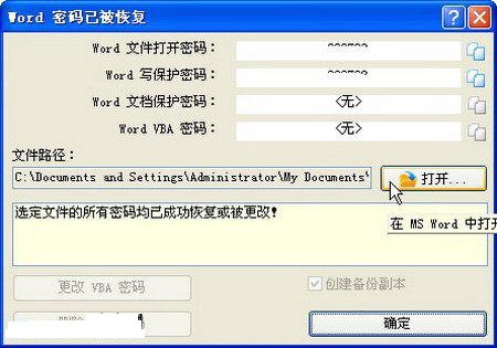 第3步,根據(jù)密碼的復(fù)雜程度,恢復(fù)過(guò)程需要使用不同的時(shí)間。成功恢復(fù)密碼后,打開(kāi)“Word密碼已被恢復(fù)”對(duì)話(huà)框。記住恢復(fù)的密碼,單擊“打開(kāi)”按鈕并輸入密碼,可以打開(kāi)加密的Word文檔。最后單擊“確定”按鈕,如下圖所示: