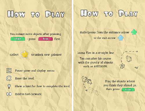 游戲操作極為簡單,大家只需用手指拖動屏幕上方長形方塊條中的道具至下方的方格中,點擊START后,LOOMA便會從箭頭的一段飛出,我們的目的是將它引到另一端的箭頭口,簡單的操作重點在于道具擺放的位置,道具是有引力的,玩家需要考慮的是將道具放在哪個位置,才可以吸引到LOOMA吃到屏幕中的星星最終回歸家園,這其中就蘊含著角度、方向、引力等物理知識,開動腦筋運用好這些物理原理,想要過關(guān)其實也沒有那么難。