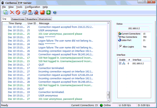 Cerberus FTP Server V2.50 英文綠色特別版 一款FTP服務(wù)器軟件,提供強(qiáng)大的多線程的FTP而不犧牲易用性。其設(shè)計(jì)思路在于盡可能少的CPU和內(nèi)存占用率。特點(diǎn)是有友好的用戶界面,可以輕松的隱藏到系統(tǒng)托盤或從中恢復(fù)??杀O(jiān)聽多個(gè)端口,可作為NT服務(wù)運(yùn)行,支持?jǐn)嗑€續(xù)傳,提供易用的管理器管理用戶權(quán)限