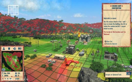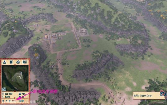 6:最后會要求你建造一個伐木場,右鍵打開建筑菜單,按照紅色箭頭指示選擇完后可以將建筑放置在任意綠色區(qū)域,滾動鼠標滑輪可以更改建筑朝向。伐木場建造完成后,本關教學任務就順利完成啦。